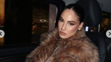 Giulia De Lellis, Look da vera diva con maxi pelliccia, crop top e mini gonna in paillettes firmato Roberto Cavalli